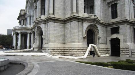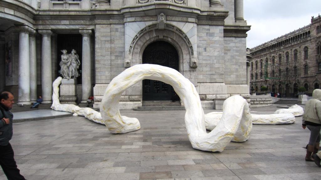 Yo la definiría como una «escultura» horrible, invasiva, innecesaria y molesta. Me preguntaba, quién habría fondeado la construcción e instalación de la tripa gigante, porque se me ocurren varias formas más eficientes de usar ese dinero para homenajear la arquitectura y arte de la ciudad. En http://www.rivelino.com.mx/raices/ me encontré con que el Rivelino tiene muchos patrocinadores. Y aplaudo el apoyo al talento mexicano, enhorabuena por el tapatío, pero, ¿de verdad? ¿tripas blancas?