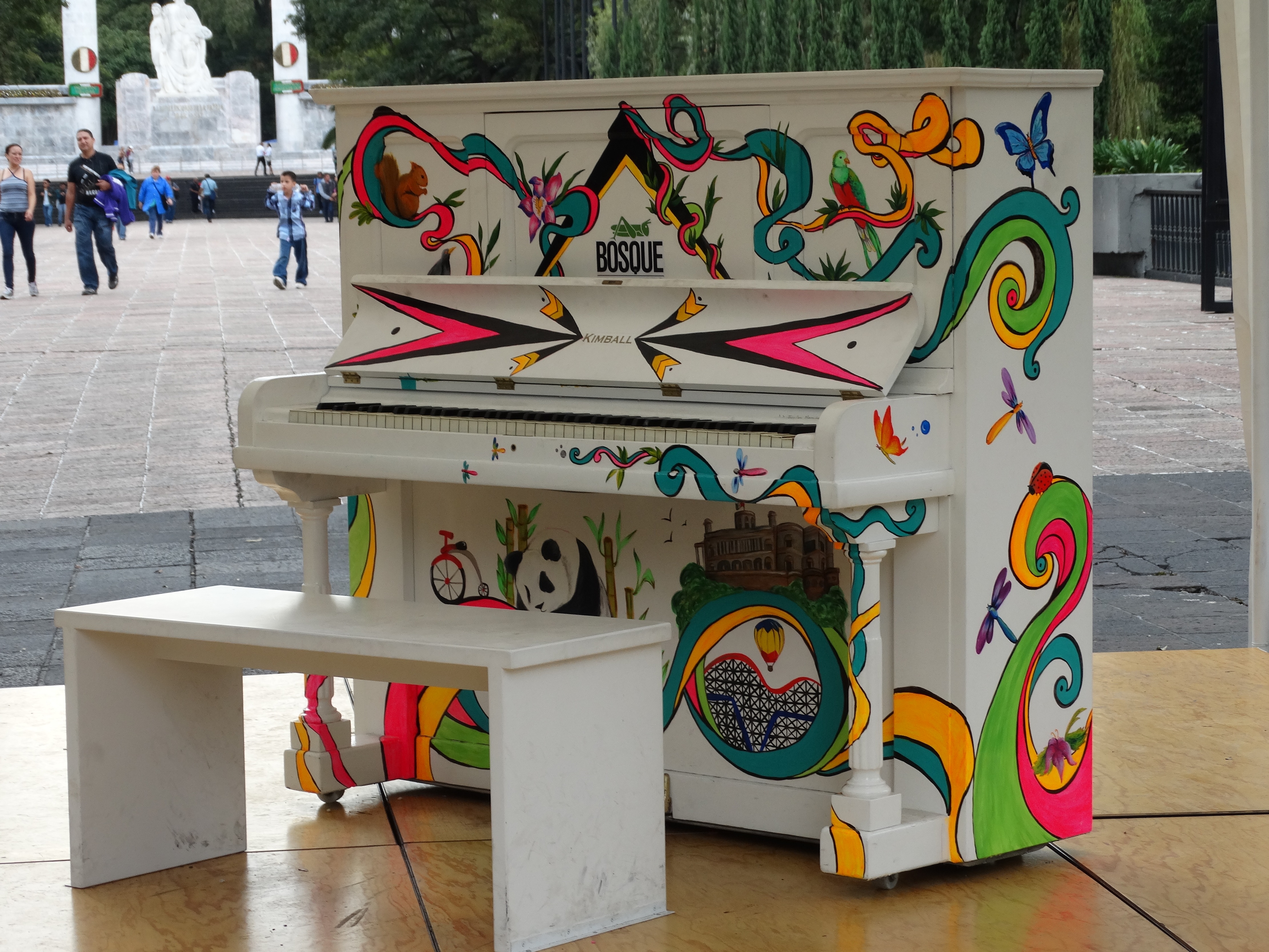 Pero ayer me encontré con otro. Un piano situado en frente de la puerta principal del Castillo de Chapultepec, esa que tiene una reja divina resguardada por leones. Resulta que la agrupación ‘Recrea Mx’ le regaló a la 2a sección del Bosque un piano Forte Vertical por motivo de su 50 aniversario. Es un piano especial ya que fue intervenido con pintura de acrílico por la artista Joceline Ramírez, egresada de la Escuela Nacional de Artes Plásticas.